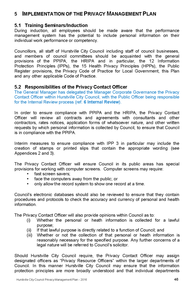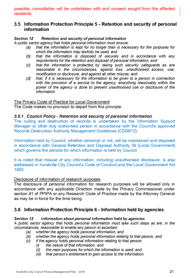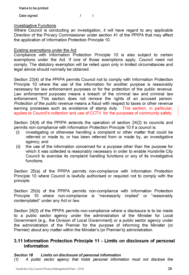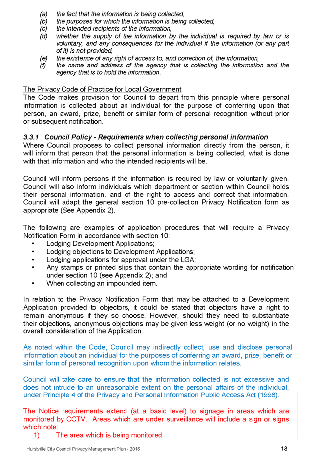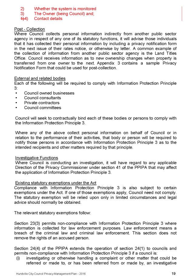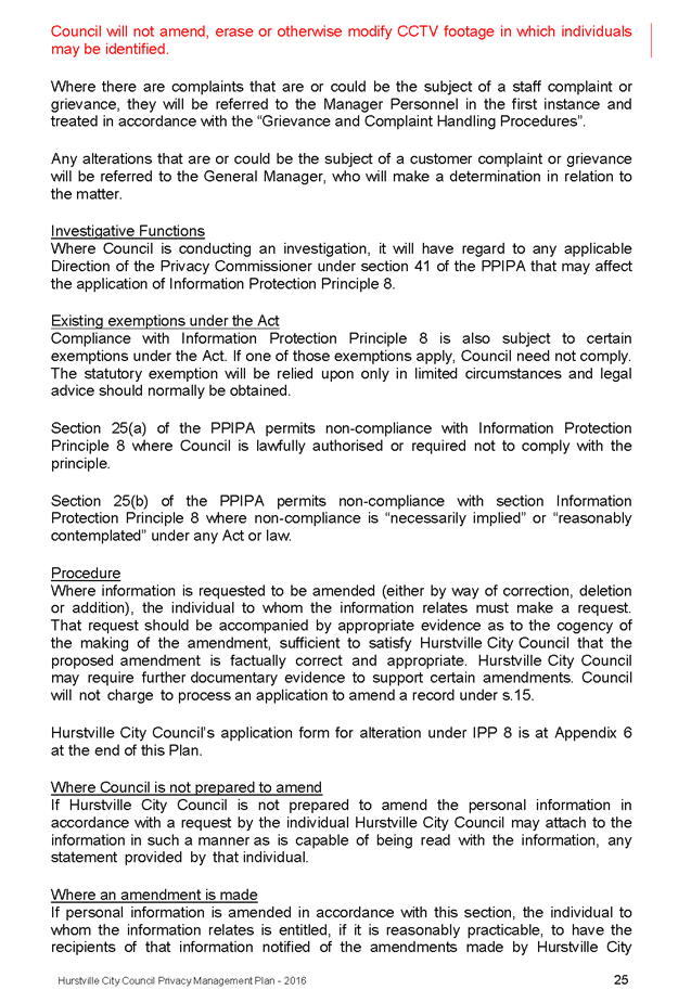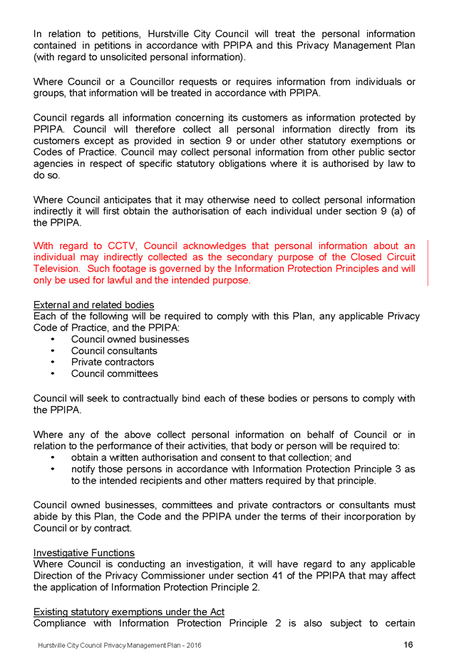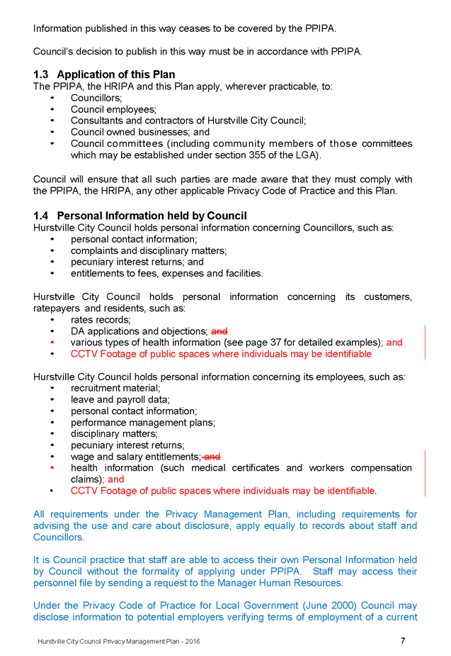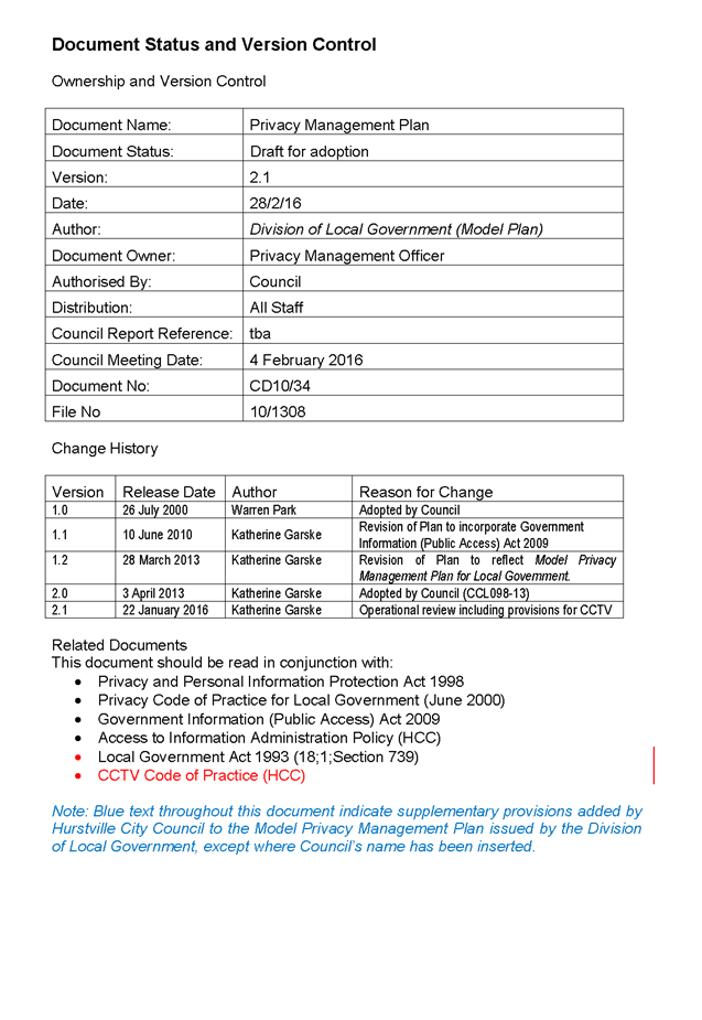 In 2013, Hurstville City Council amended the Privacy Management Plan to reflect the Revised Model Plan released by the Office of Local Government that same year. Following implementation of CCTV across the Local Government area, it is appropriate that the Privacy Management Plan be reviewed to incorporate the new medium.
