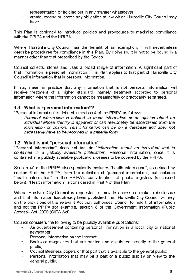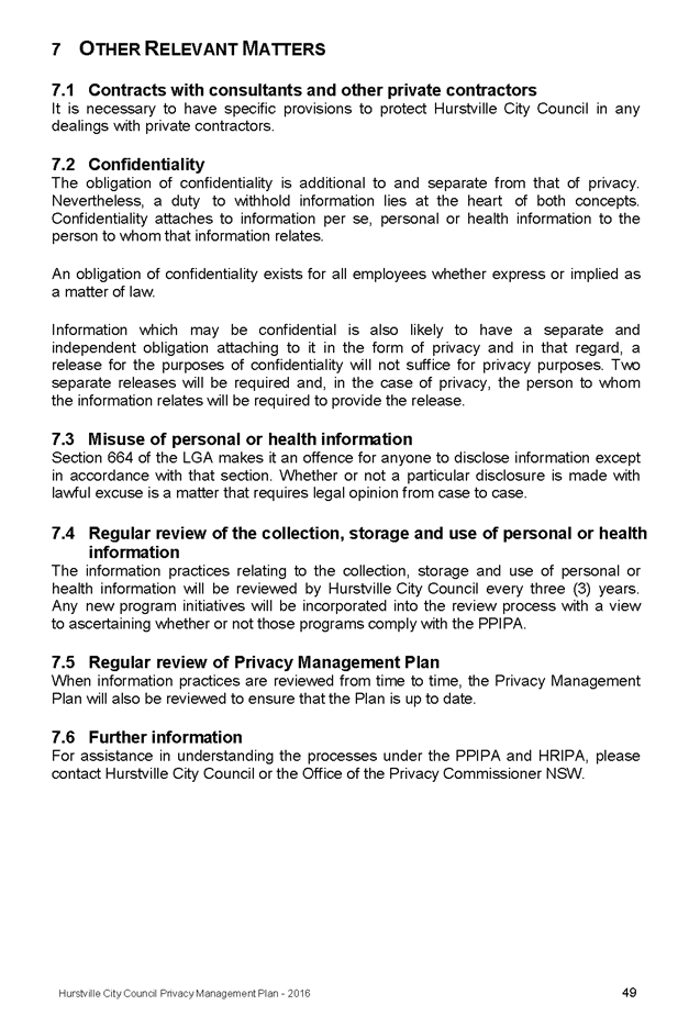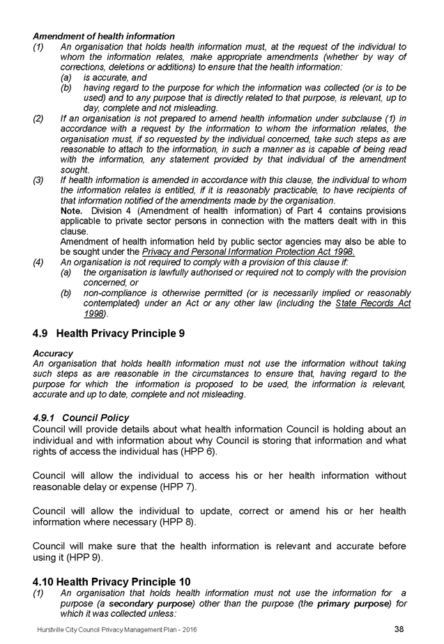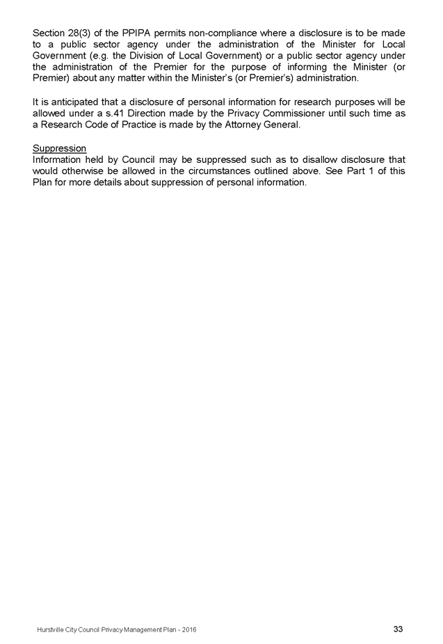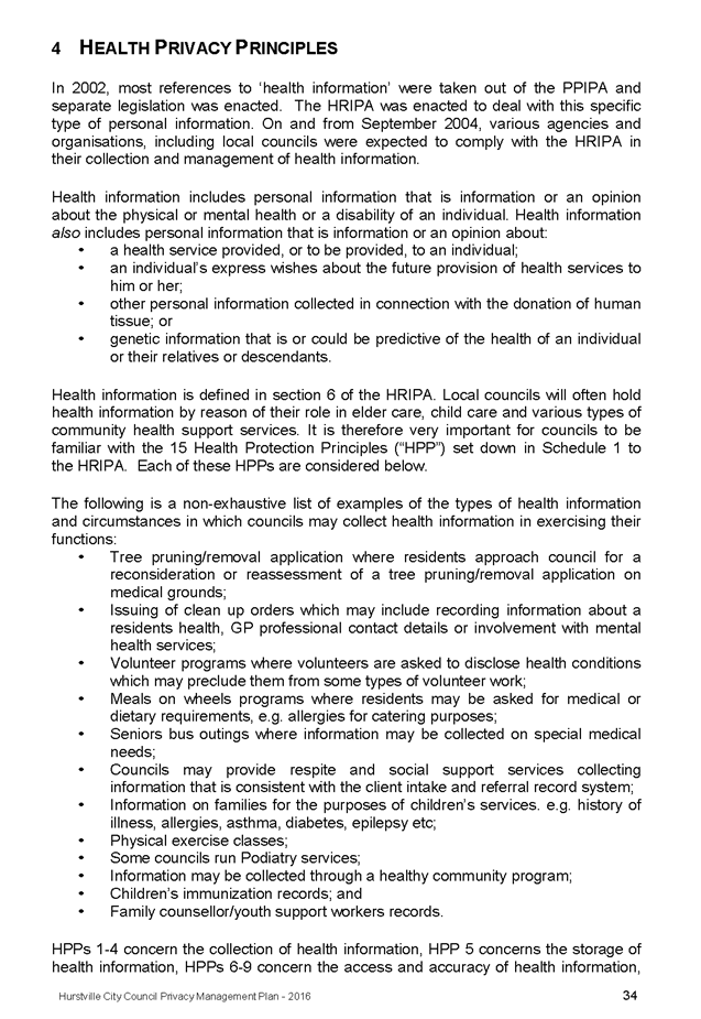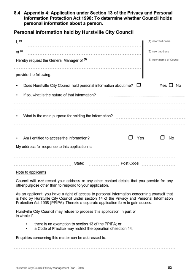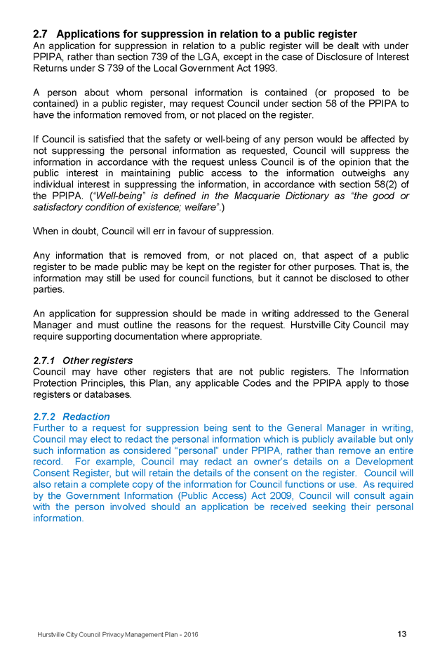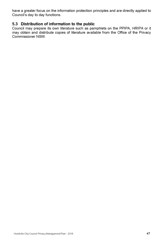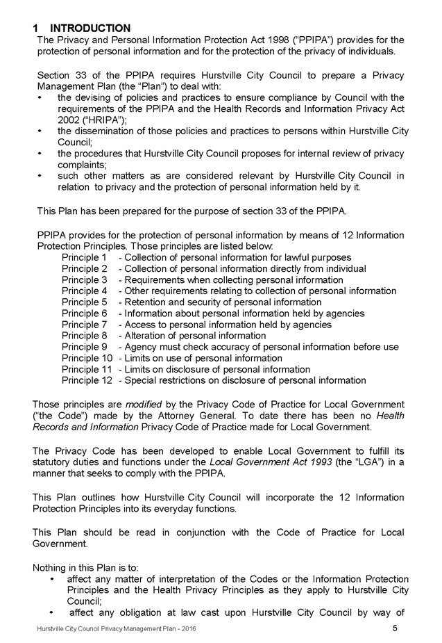 In April 2013, Hurstville City Council adopted an amended Privacy Management Plan to reflect the Revised Model Plan released by the Office of Local Government that same year.
