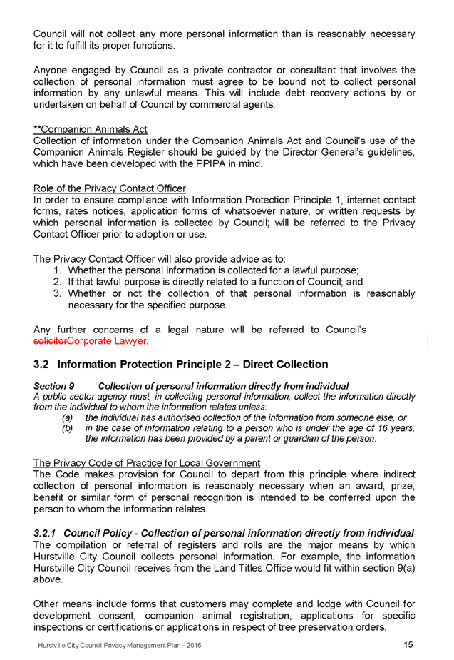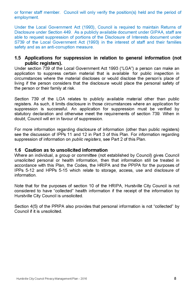 The provision under S739 of the Local Government Act for staff to request suppression of their residential details and the policy that staff not be individually identified where they have fulfilled their duties under the auspices of Council have been included. A recent example was where an individual seeks ‘who was responsible’ for a budget. The Budget is adopted by Council and as such it is not appropriate to ‘name’ an individual Manager (as the case may be). |