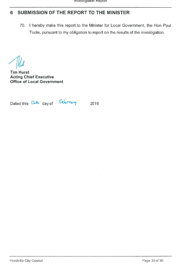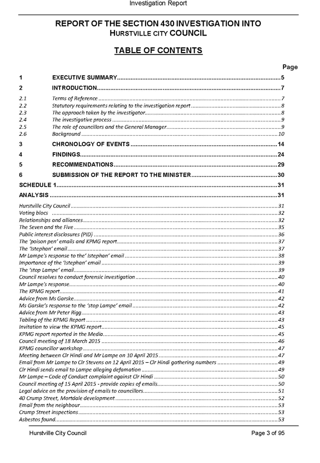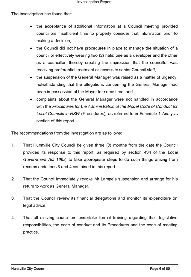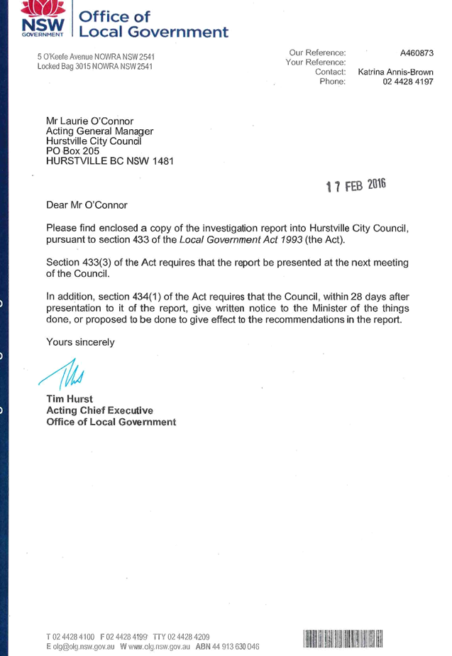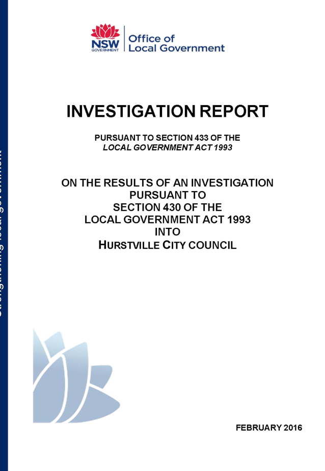 This report contains the recommendations of the results of an investigation under section 430 of the Local Government Act 1993 (LG Act) into Hurstville City Council. The report has been presented to the Minister for Local Government and has been copied to Council pursuant to s433(1) of the LG Act.