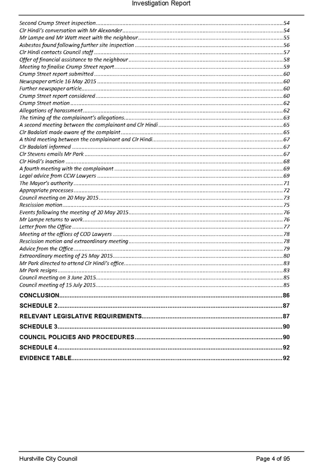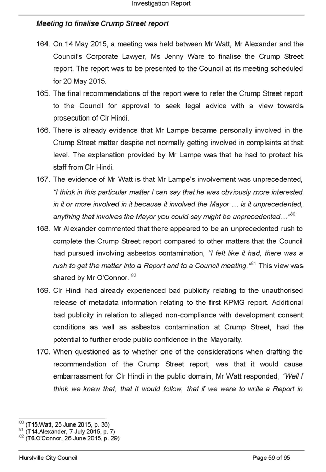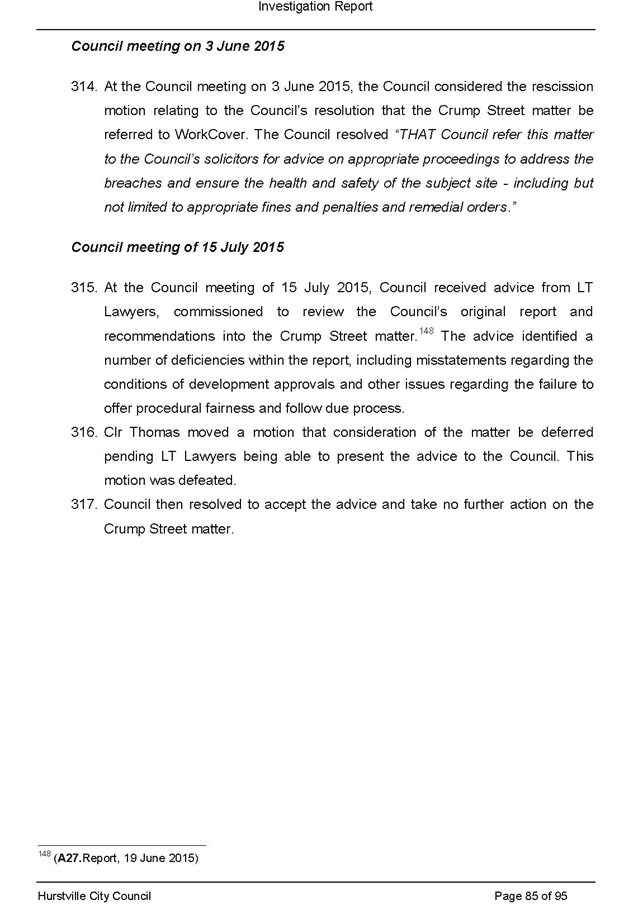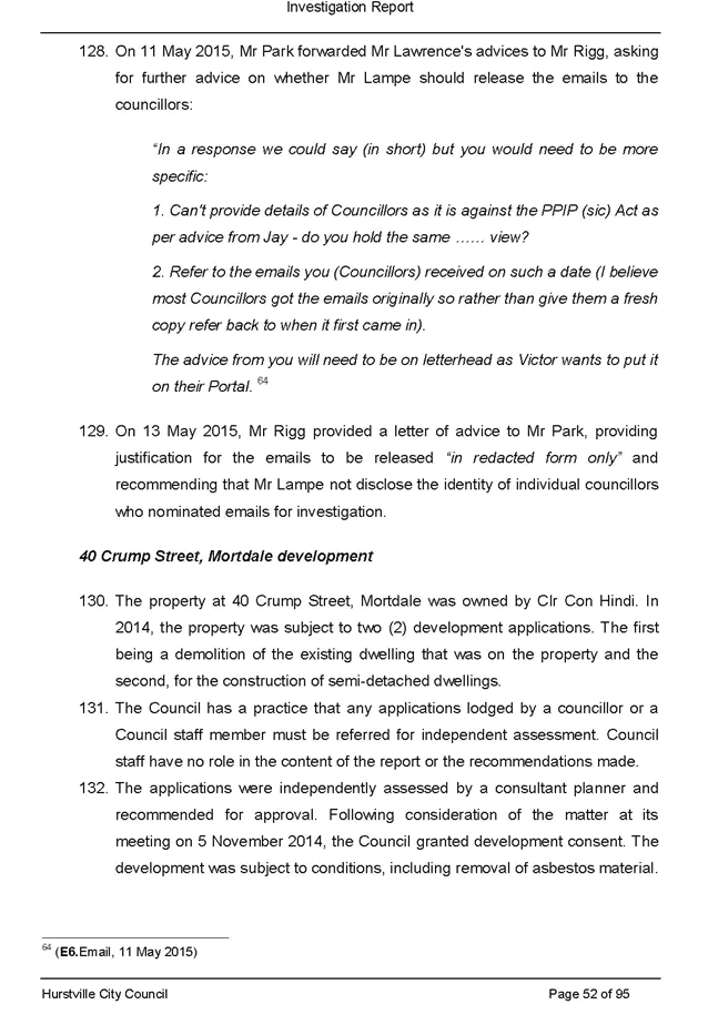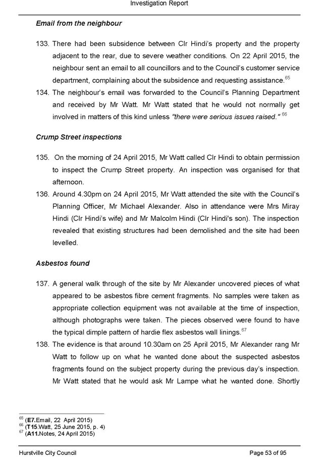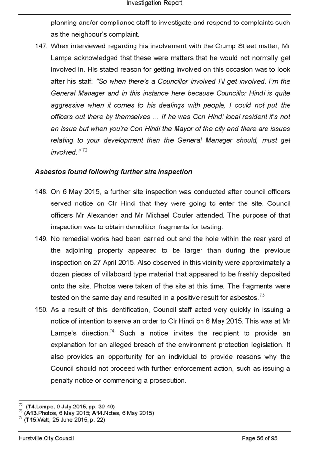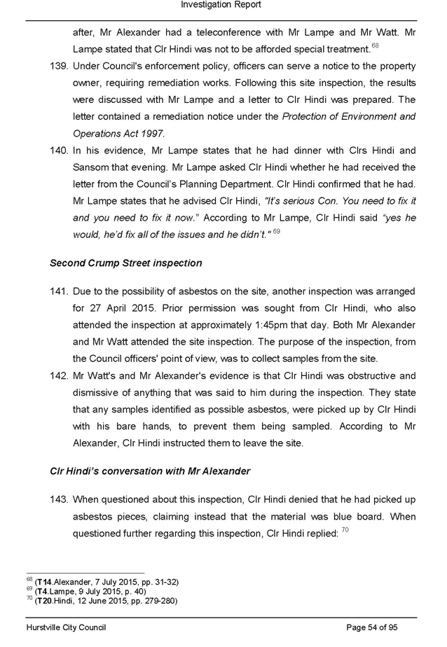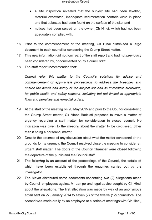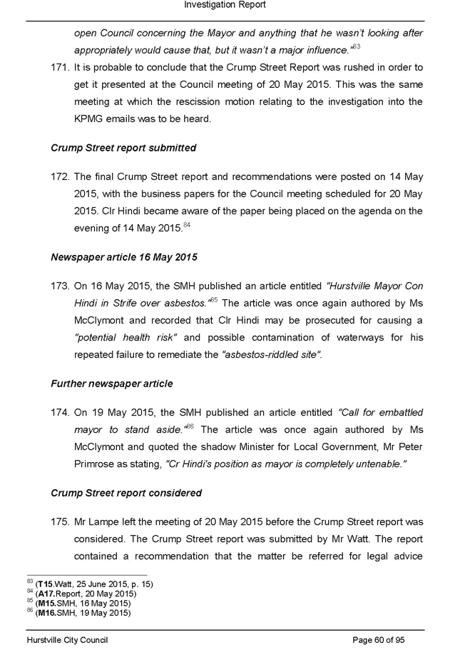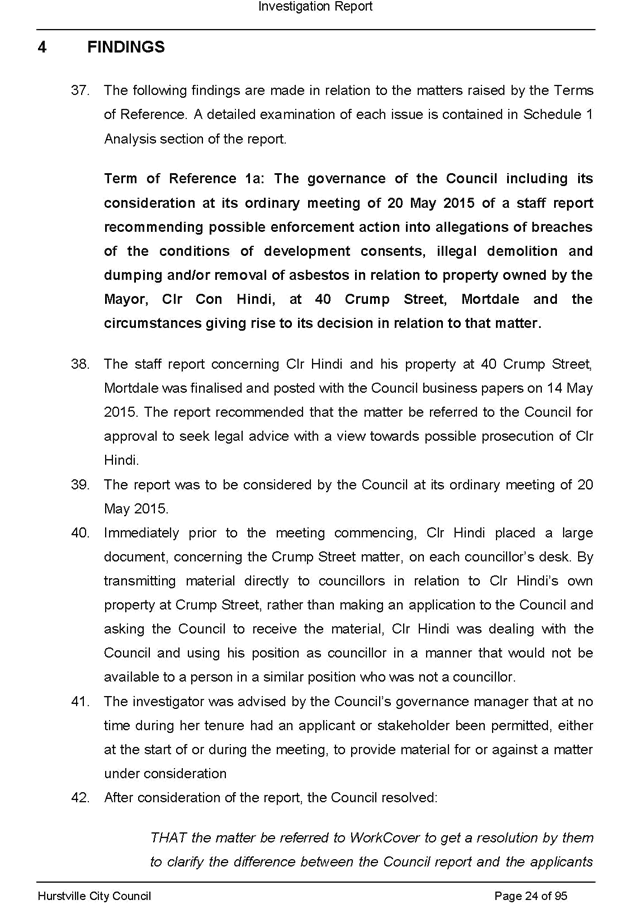 a. Its consideration at its ordinary meeting of 20 May 2015 of a staff report recommending possible enforcement action into allegations of breaches of the conditions of development consents, illegal demolition and dumping and/or removal of asbestos in relation to property owned by the Mayor, Clr Con Hindi, at 40 Crump Street, Mortdale and the circumstances giving rise to its decision in relation to that matter; and