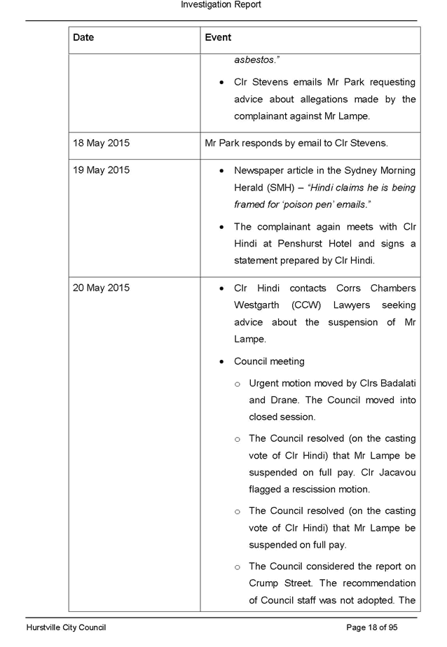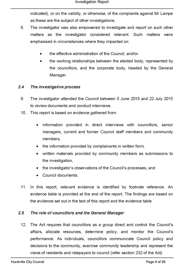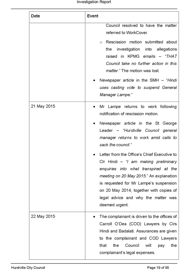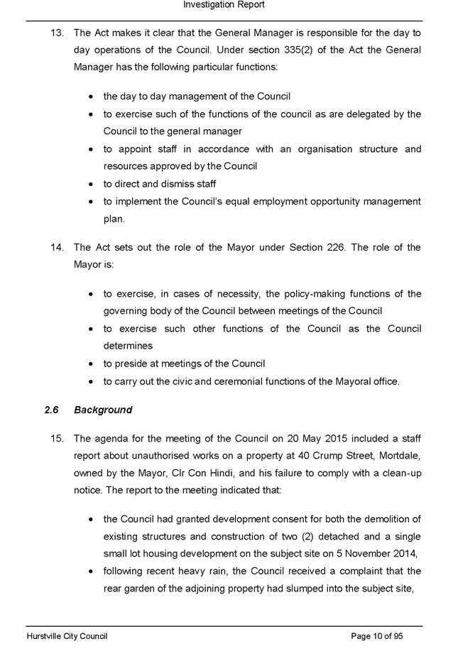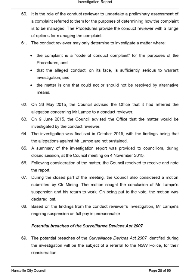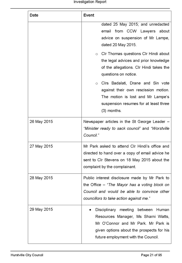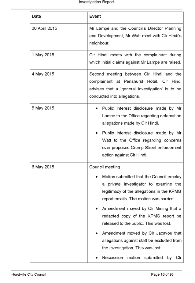 On 29 May 2015 the Council’s Mayor and Acting General Manager were provided with formal notification of the investigation.