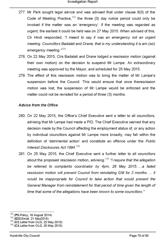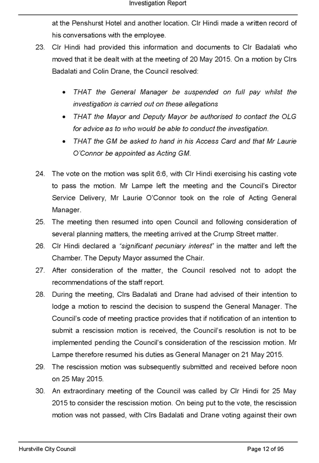 b. Its suspension of the General Manager, Victor Lampe, at the same meeting, the circumstances giving rise to that decisions, and any subsequent action taken by the Council and councillors in relation to that decision; and