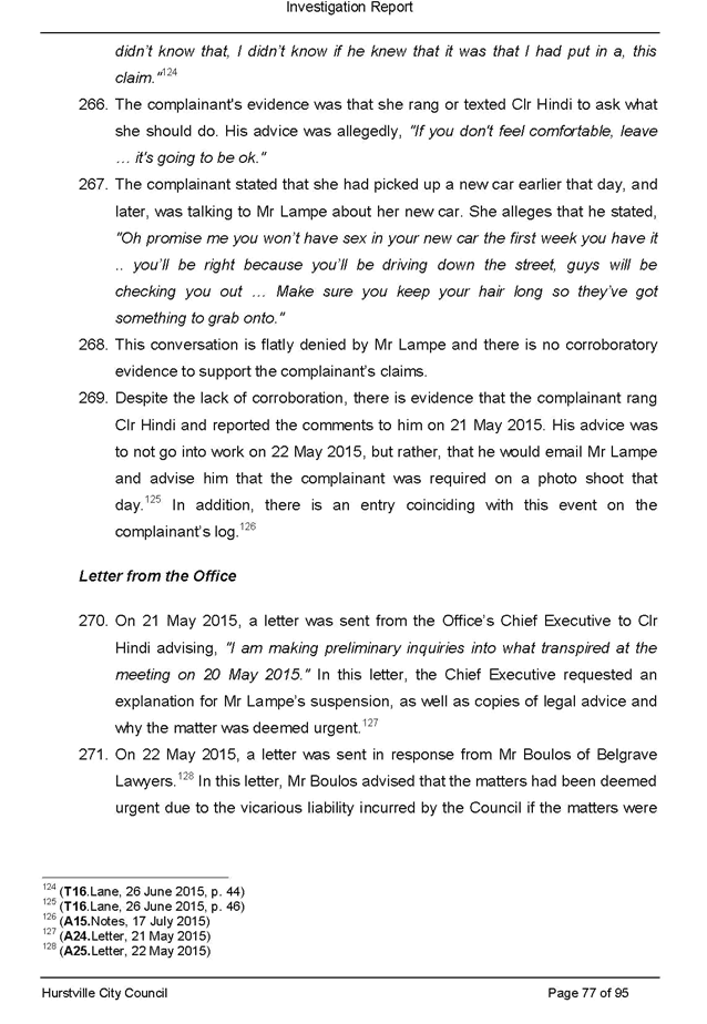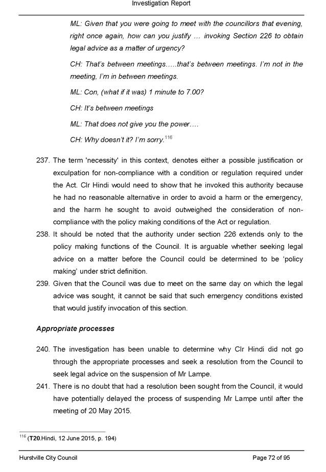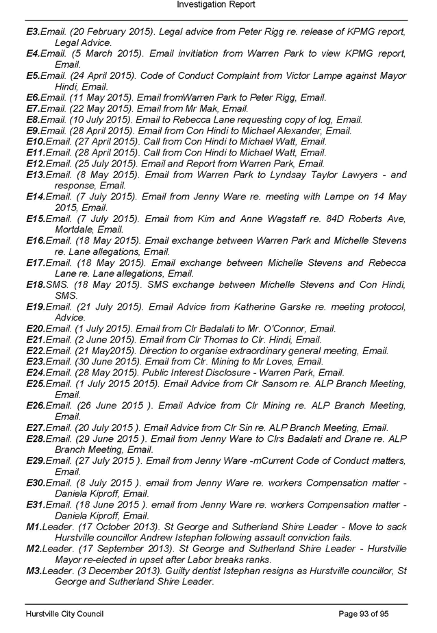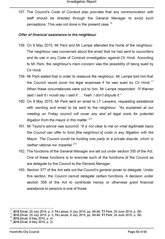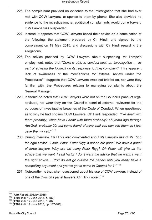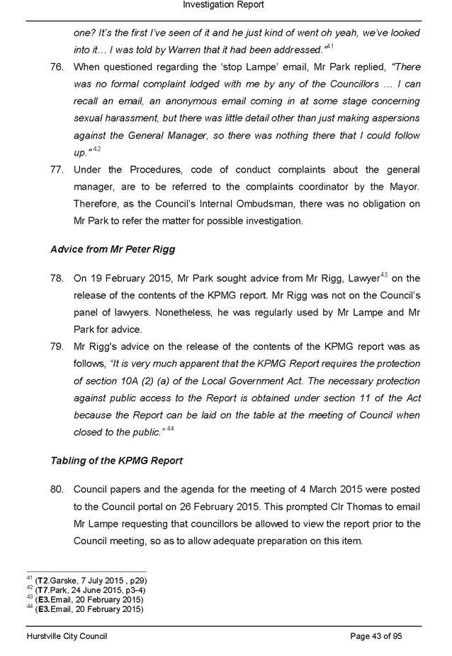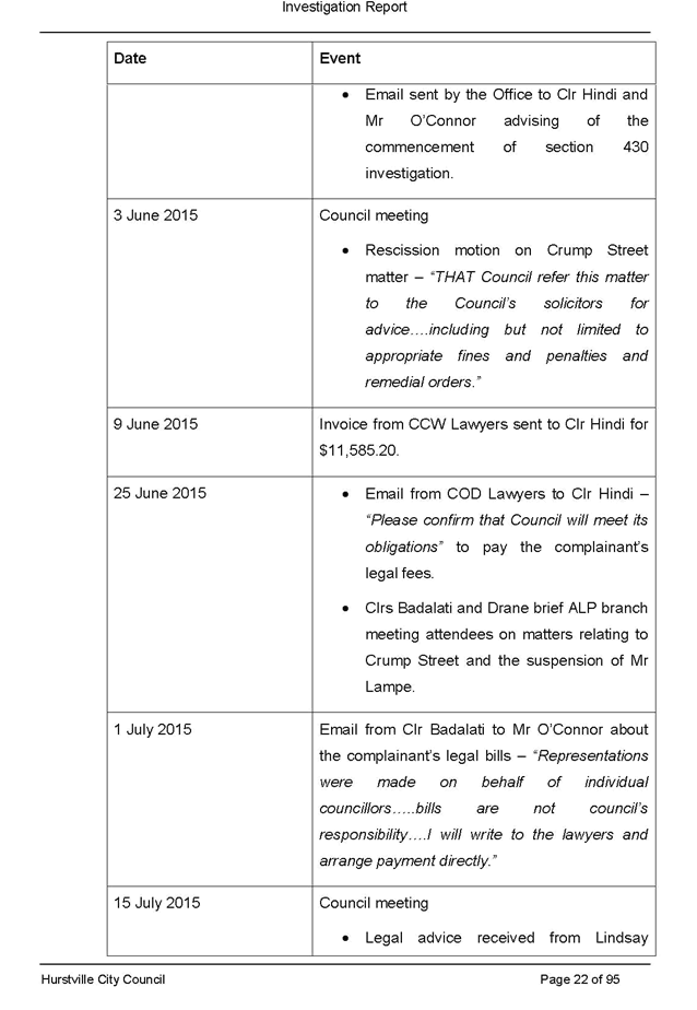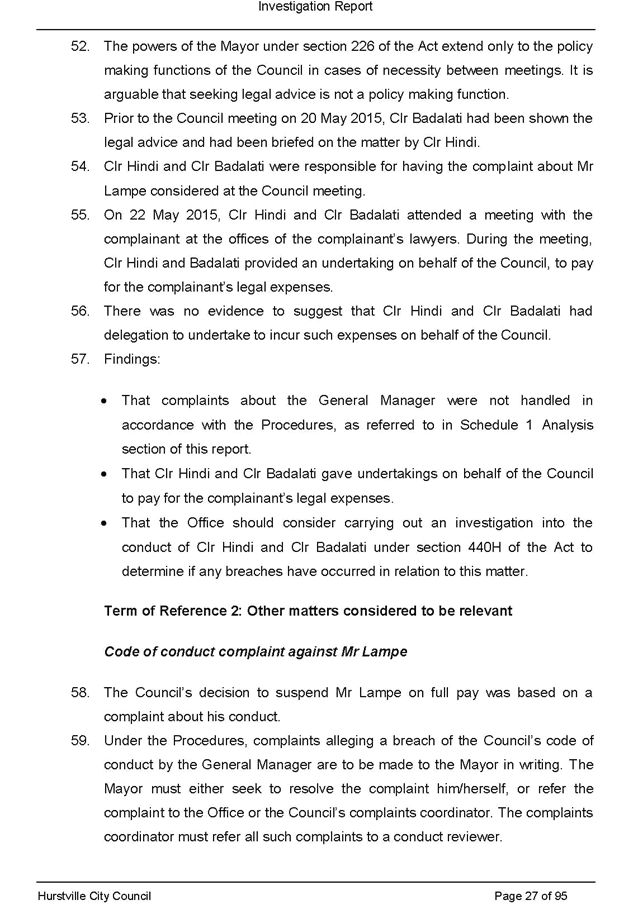 · itemised list of all pieces of legal advice paid for by Council related to the section 430 investigation and the investigation of the complaint made against Victor Lampe (this includes any advice authorised directly by Council, the General Manager or other staff member as well as any unauthorised advice secured during this period)