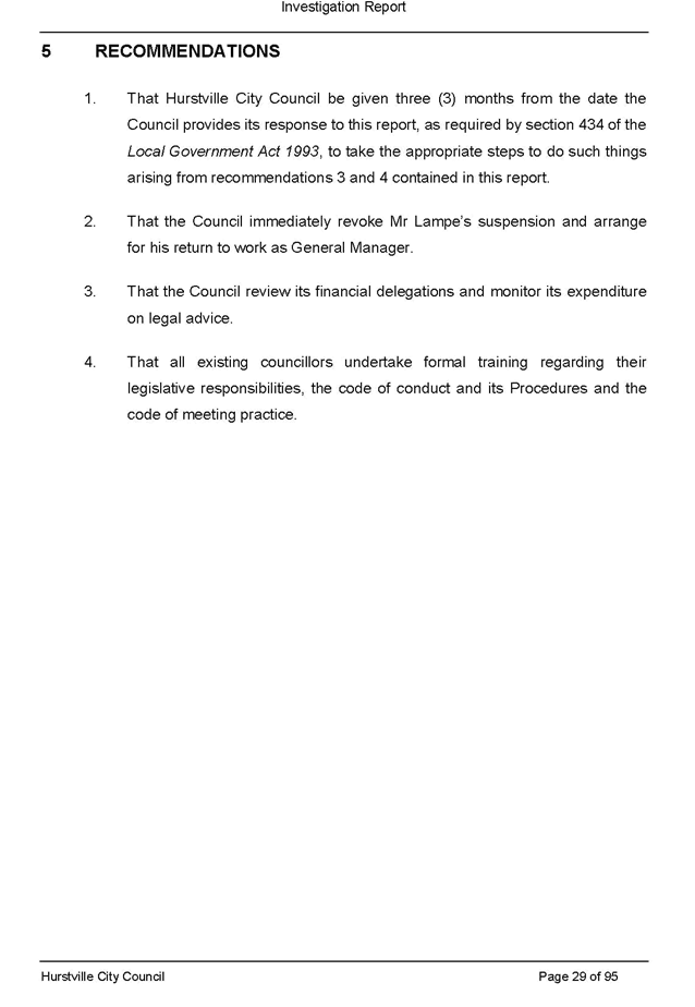 1. THAT Hurstville City Council be given three (3) months from the date the Council provides its response to this report, as required by section 434 of the Local Government Act 1993 to take appropriate steps to do such things arising from recommendations 3 and 4 contained in this report.